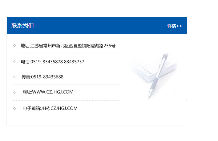 地址:常州市新北區(qū)友邦商務(wù)大廈1幢16、17層  電話:0519-85101652  傳真:0519-85112595  郵編:213022  網(wǎng)址:www.cz-jiayue_cn.souldger.com  郵箱:xiajifengaa@163.com